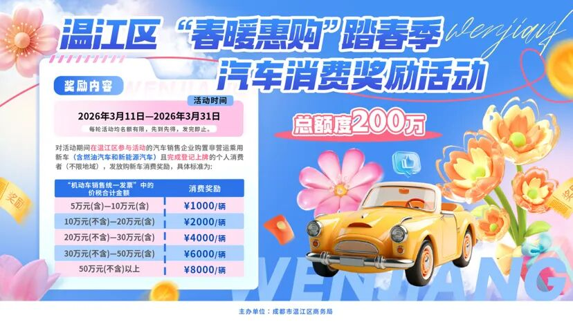 3月11日,由成都市温江区商务局主办的“春暖惠购”踏春季汽车消费奖励活动正式拉开帷幕。此次活动总资金规模达200万元,旨在激活春季汽车消费市场,为广大购车市民带来实实在在的优惠。本次活动面向不限地域的