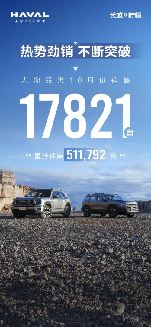 刚刚过去的十月份,国内汽车市场再次见证了哈弗大狗品类的强劲实力。数据显示,哈弗大狗品类10月热销17821台,累计销售511792台,这是其连续第五个月保持破万“姿势”,且实现五连涨。在汽车整体市场保