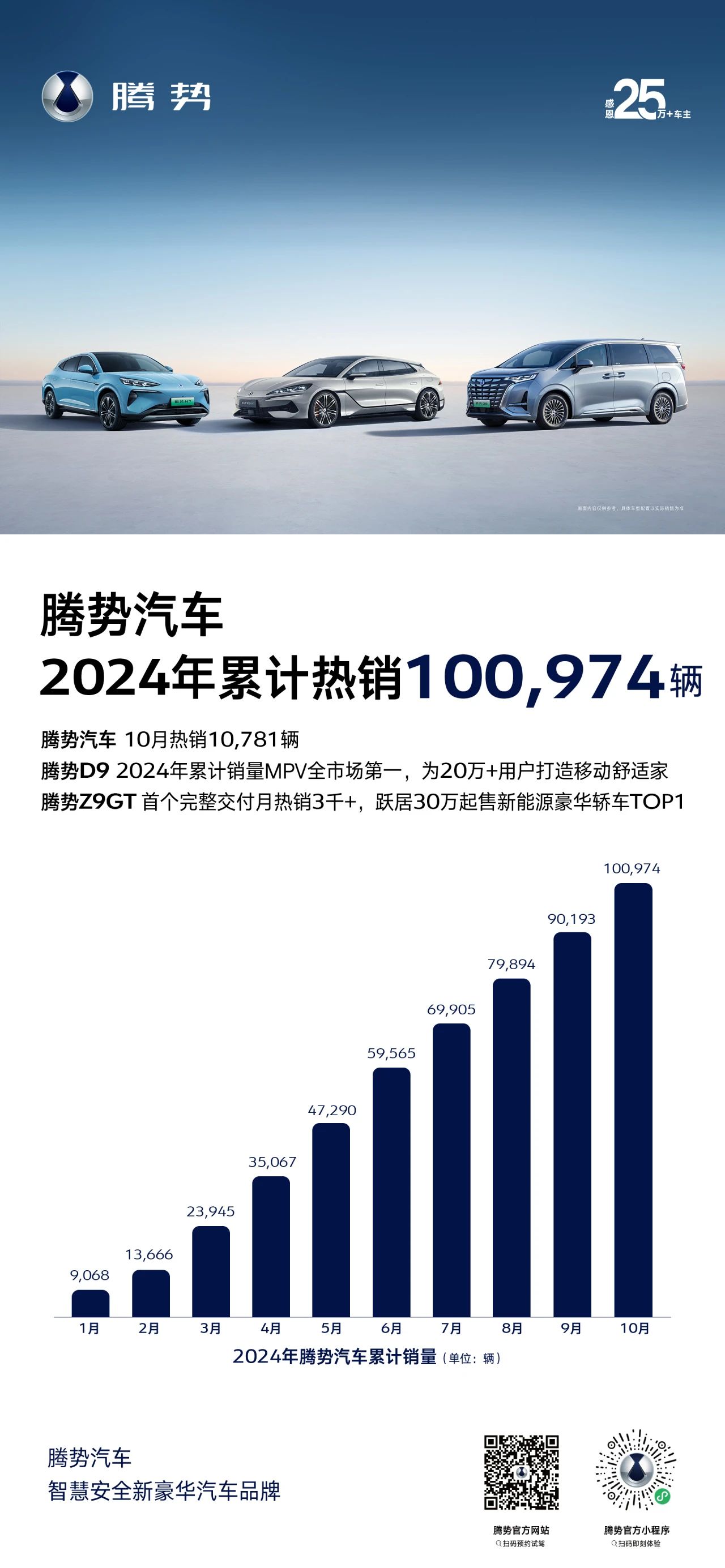 腾势汽车10月热销10781辆,2024年累计热销100974辆,持续为用户创造感官价值,智享科技新豪华!腾势D92024年累计销量MPV全市场第一,宜商宜家,王者风范,为20万+用户打造新时代移动舒