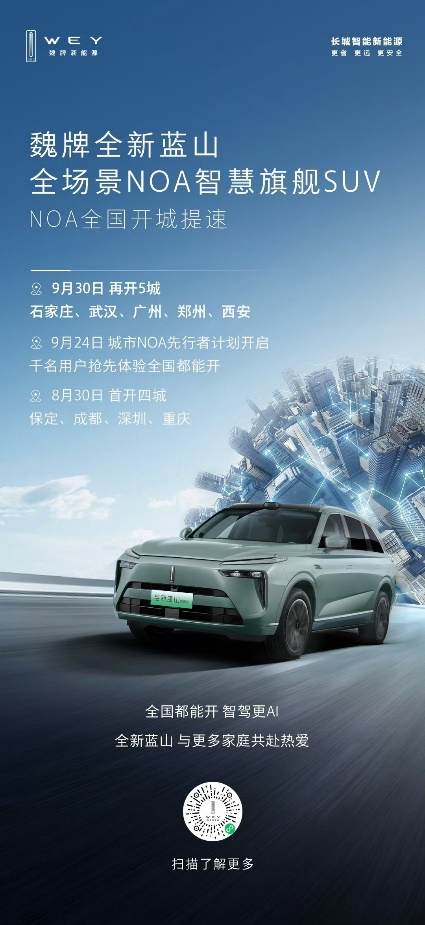 9月30日,魏牌全新蓝山的城市NOA再次取得重大进展,其智驾开城版图进一步扩张至石家庄、武汉、广州、郑州、西安五座重要城市。继保定、成都、重庆、深圳四城开通之后,全新蓝山的城市NOA智驶网络实现了又一