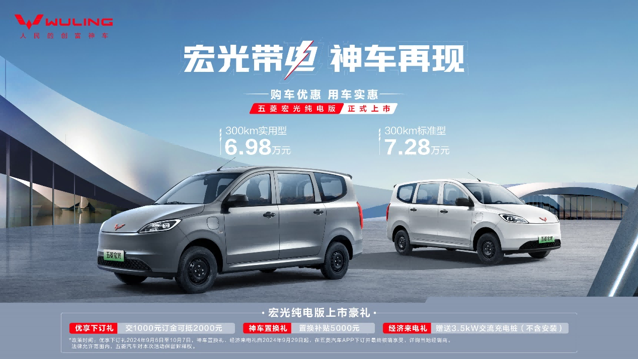 2024年9月29日,五菱新能源商用车原生架构下首款车型五菱宏光纯电版正式上市,售价6.98万元-7.28万元。新车推出续航里程为300km的实用型和标准型两个版本,两种座椅布局选项,搭载75kW高功