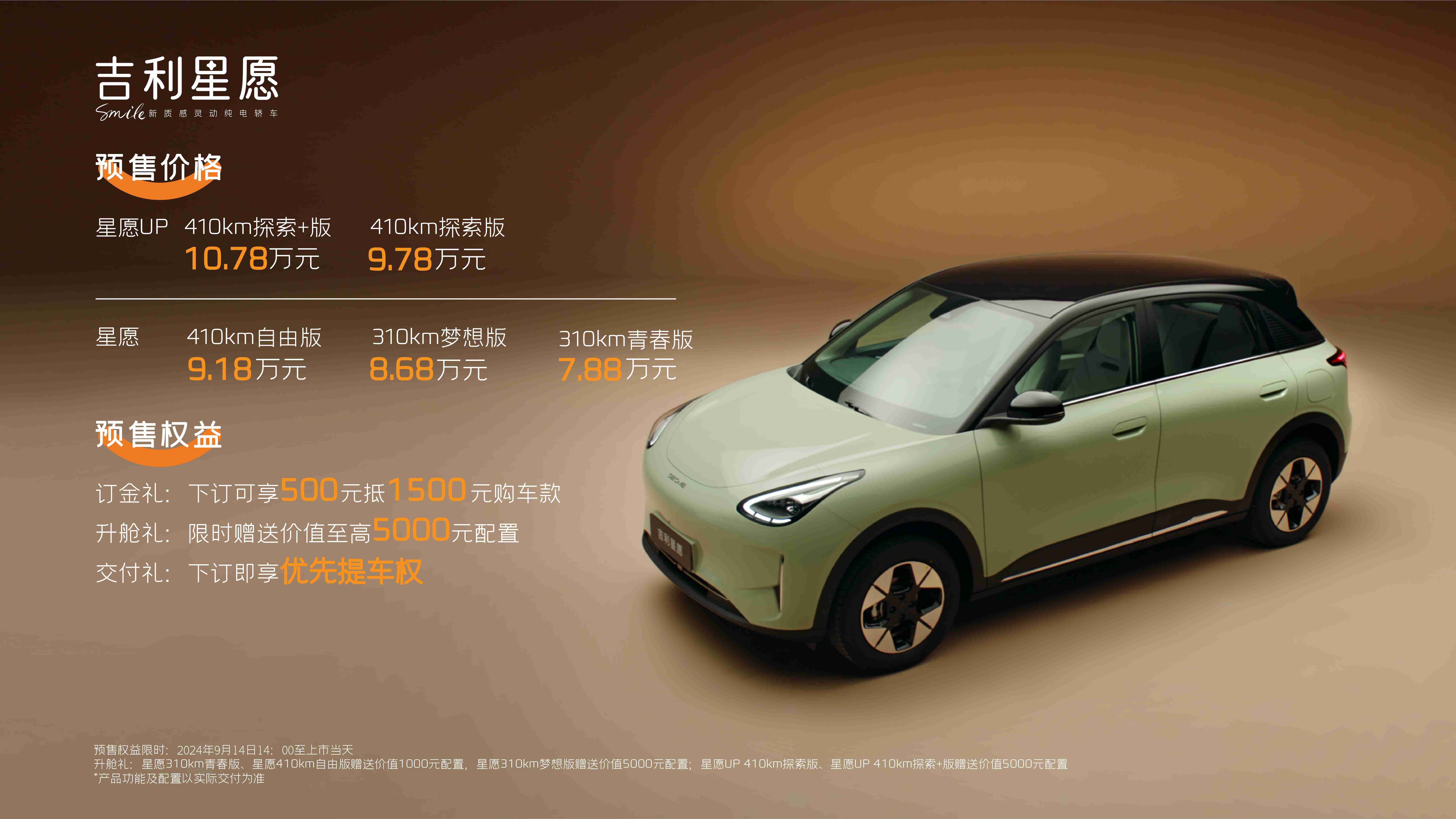 据悉,吉利品牌旗下全新A0级纯电轿车吉利星愿,将于10月9日在成都正式上市。此前,吉利星愿已开启预售,共推出星愿UP和星愿共 2大车系5大版型,其中包括星愿UP 410km探索+版和410km探索版,