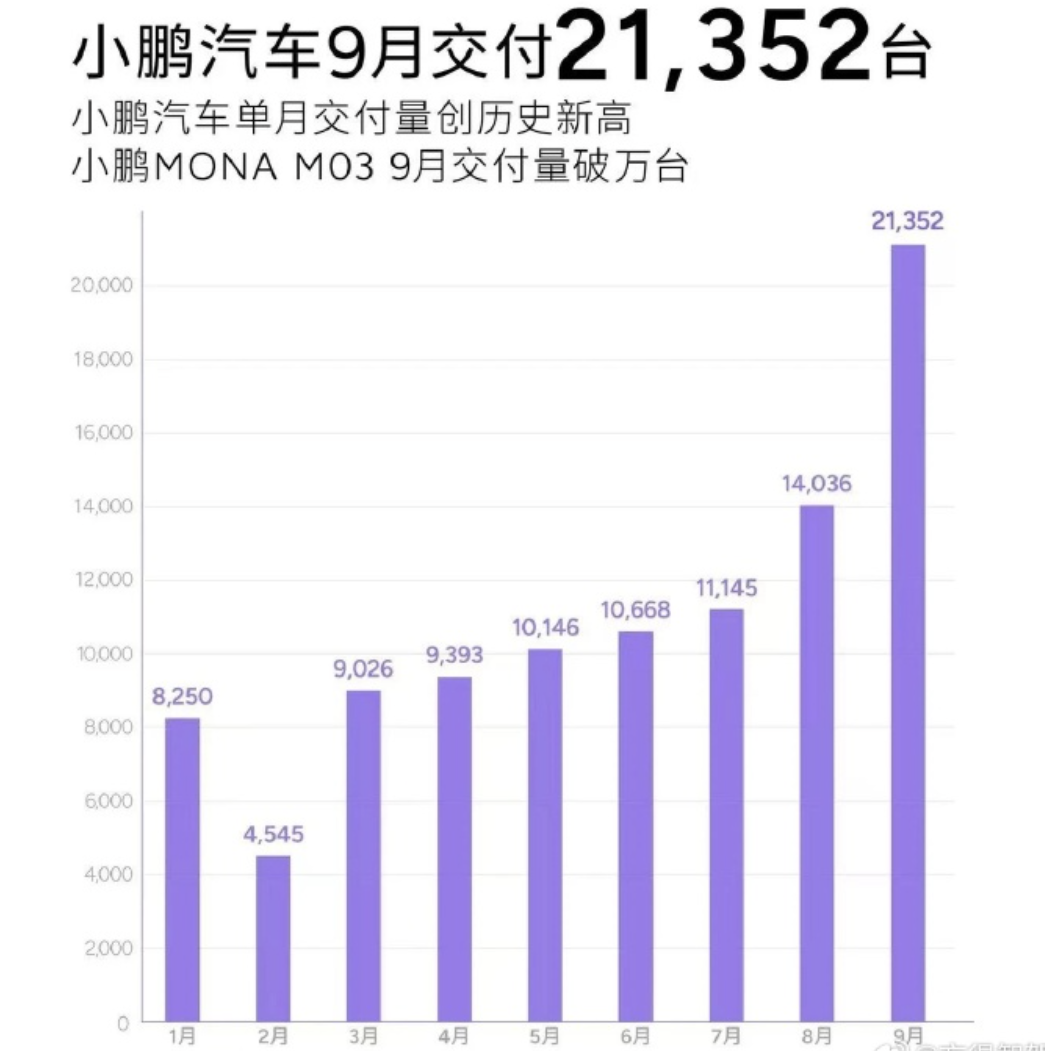 小鹏9月,创单月交付历史新高!2024年9月,小鹏汽车共交付新车21,352台,同比增长39%,环比增长52%!其中,小鹏MONA M03交付破万台。2024年1月-9月,小鹏汽车累计交付新车共98,