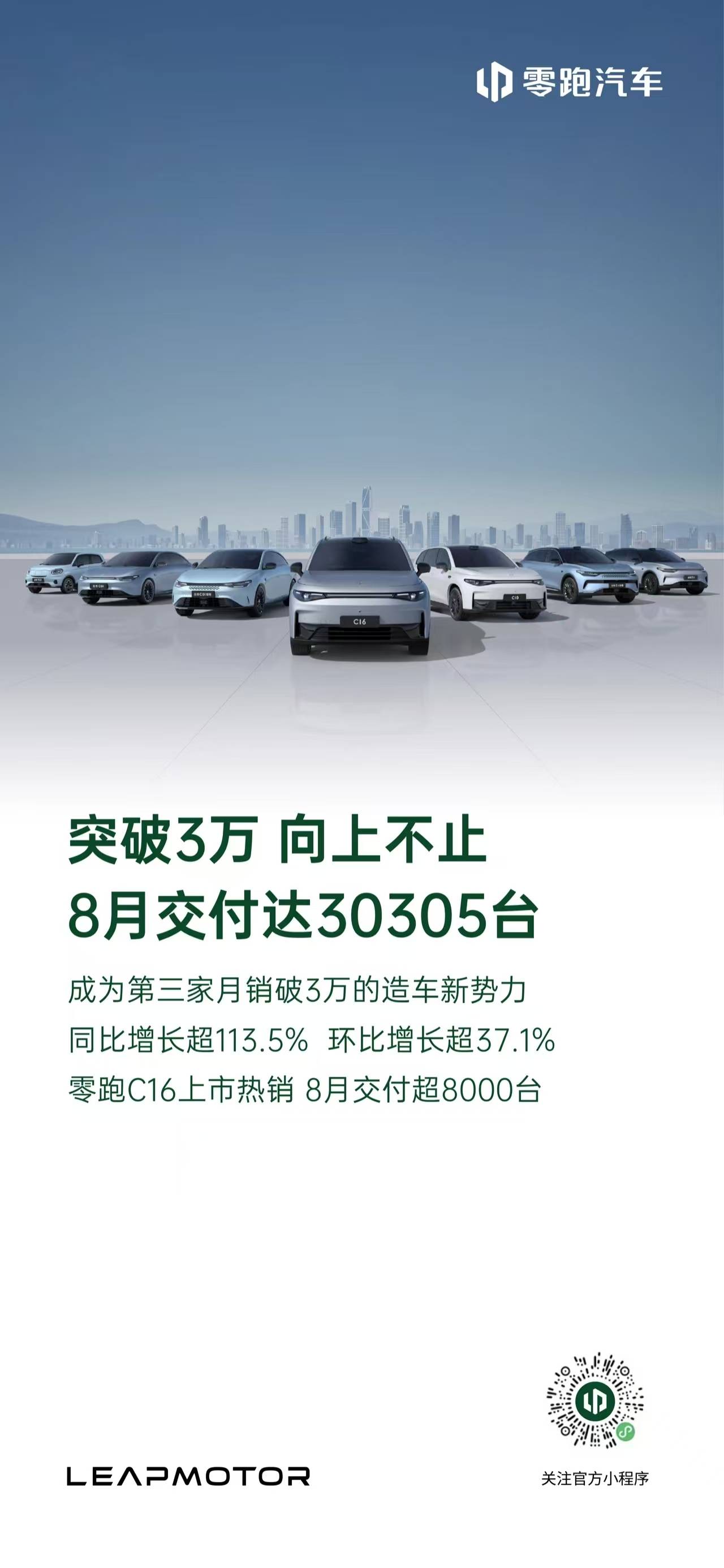 零跑8月交付达30305台,成为第三家月销破3万台造车新势力