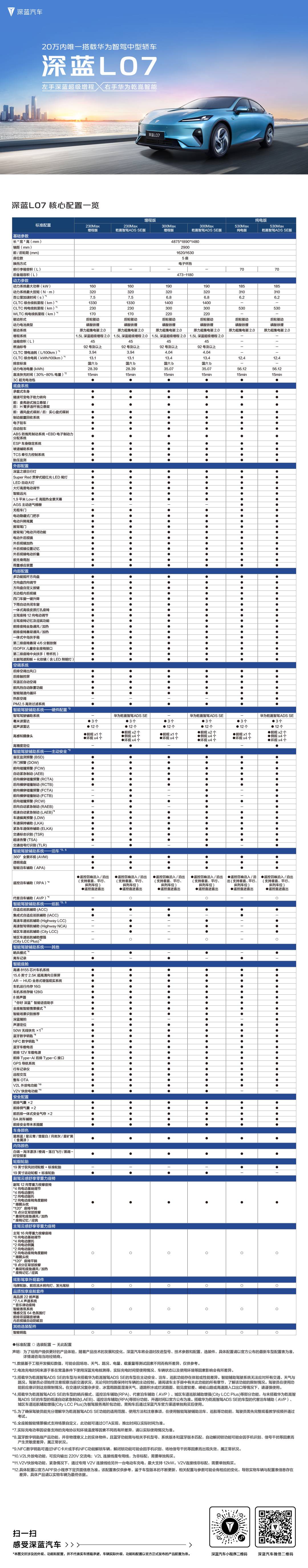 9月19日获悉,“科技智享中型轿车”深蓝L07更多配置参数与车辆信息,今日提前曝光,从相关信息来看,此次深蓝L07共计带来6款车型,包括4款增程版车型:230Max增程版、230Max乾崑智驾ADS