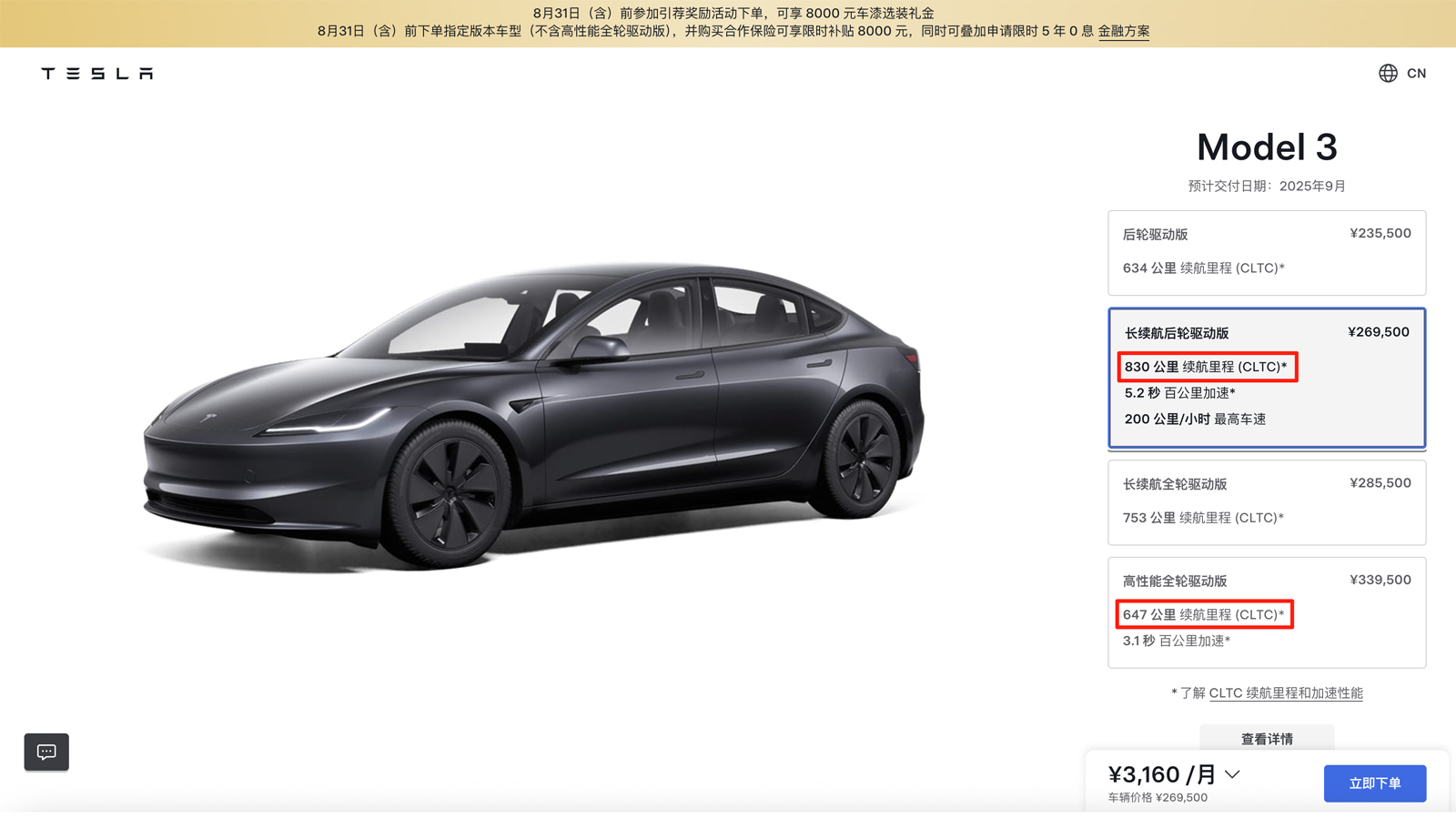 特斯拉中国上线Model 3长续航后轮驱动版车型 续航高达830公里