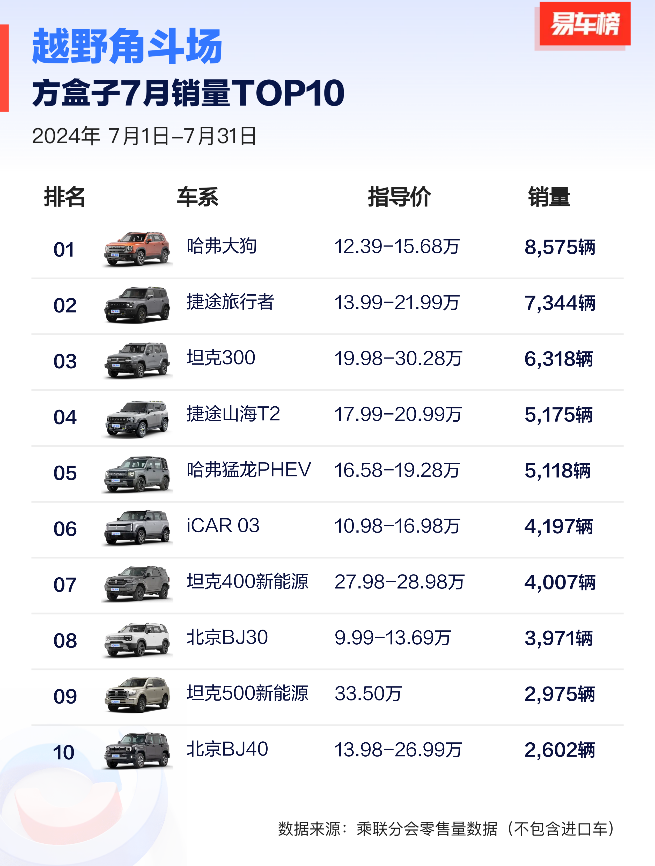 不知从什么时候起,市面上顶着“方盒子”造型的SUV越来越多,令人看得眼花缭乱。究竟哪个“方盒子”更受消费者的喜爱呢?乘联会公布的7月销量数据显示,哈弗大狗7月销量达到了8575辆,在“方盒子”领域处于