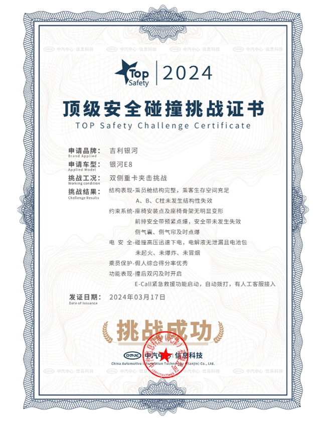 近日,吉利银河E8在中汽中心安全试验室,顺利通过行业首次20吨失控重卡夹击魔鬼碰,再次刷新中国新能源汽车安全标准。本次试验主要模拟十字路口失控车辆引发的侧碰连环撞,也是一项各种难度叠加的安全试验。一方