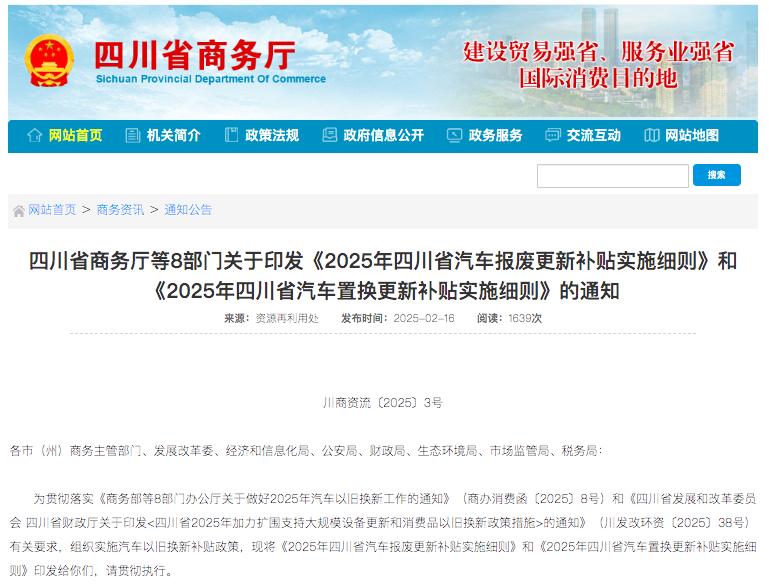 四川省商务厅近日明确,2024年8月26日至12月31日期间完成部分购车手续的消费者,若在2025年2月28日前补齐材料(包括旧车转让证明、新车发票及登记证书等),可按照2025年最新补贴标准申领置换