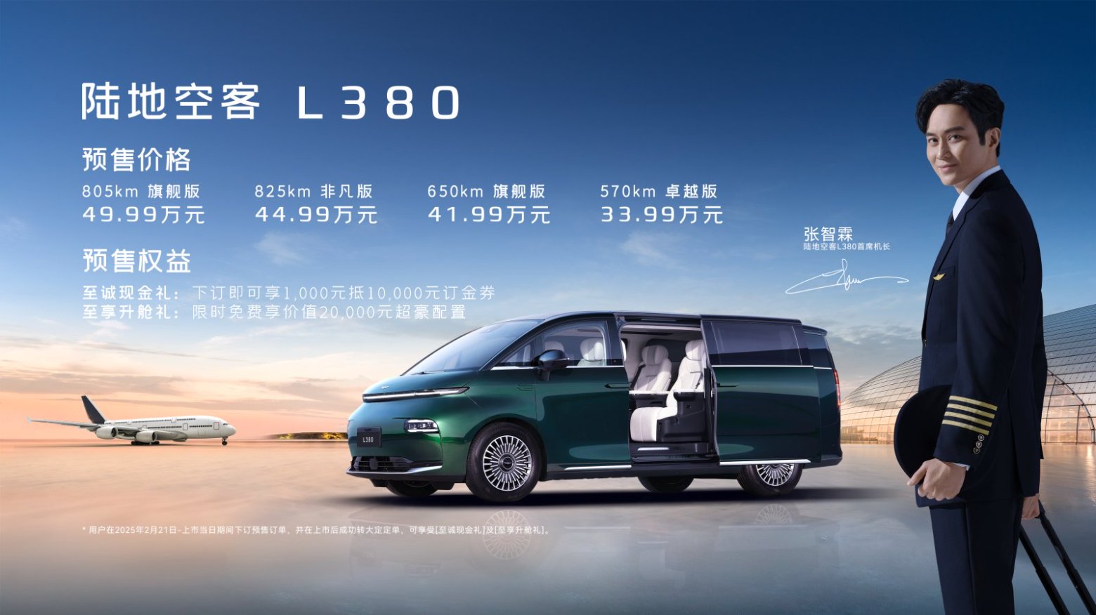 2月21日,吉利银河翼真L380「陆地空客系列」正式开启预售,新车共推出4个版型,预售价33.99万元-49.99万元。价格一步到位,更有丰厚福利,即日起至上市当日下订的用户,可享受双重预售权益:至诚